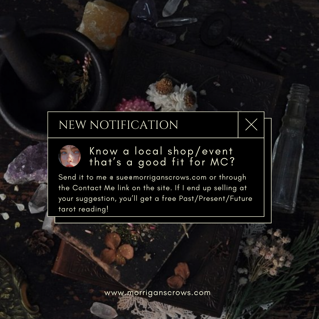 Then tell me about a great shop or event in Minnesota or Wisconsin that'd be a great fit for Morrigan's Crows. Click Contact Me and tell me about it. If I sell there, you'll get a free Past/Present/Future tarot Reading.